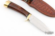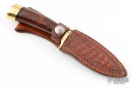 This knife by Browning Knives features a satin finished blade with .115" blade stock and .944" blade depth, hidden tang construction. The handle has a brass guard and butt, dymondwood grip with black spacers. Comes with a hand tooled brown leather sheath. Has some scratches and patina, otherwise good condition.
