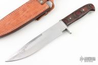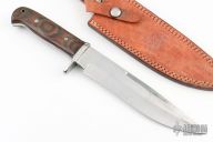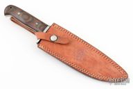 This knife by CFK Cutlery Company features a satin finished spear point blade with false top edge, .216" blade stock and 1.491" blade depth, hidden/frame tang construction. The handle has a stainless steel guard, canvas micarta scales. Comes with a brown leather sheath. Has some light scratches and patina, otherwise good condition.