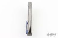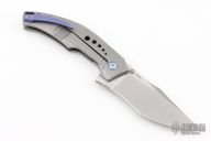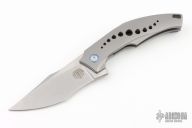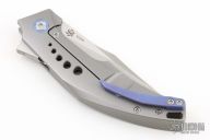 This SOS Flipper by Mechforce is a Tashi Bharucha design, it has a stonewashed blade with satin flats, notched thumbrest and flipper. The handle has a bead blasted titanium frame with blue anodized titanium pivot collars and tip up clip. Rides on bearings, nice detent, lockup and blade seating. Comes with Lothar zipper case. Has scuffs and scratches, great user condition otherwise.