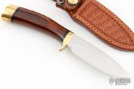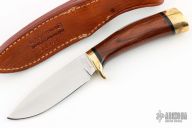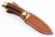 This knife by Browning Knives features a mirror finished blade with .103" blade stock and 1.005" blade depth, hidden tang construction. The handle has a brass guard and butt, dymondwood grip with black spacers. Comes with a hand tooled brown leather sheath. Excellent condition.