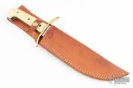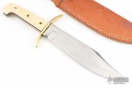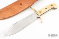 This Bowie by Peter Bromley features a hand rub satin finished clip point blade with false top edge, .163" blade stock and 2.089" blade depth, full tapered tang. The handle has a brass guard, bone scales with wood liners. Includes leather sheath with belt loop. Has light scratches and oxidation spots, otherwise good condition.