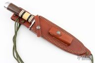 This fighter from Martin Knives features a satin finish clip point blade with sharpened top edge, .208" blade stock and 1.222" blade depth, hidden tang construction. The handle has a nickel silver guard, multi-piece micarta grip and aluminum pommel. Includes a Randall Model C brown leather sheath with a stone. Excellent condition.  Dated 07