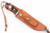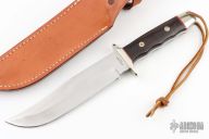 This bowie from A.G. Russell features a satin finished blade with a false top edge, .225" blade stock and 1.522" blade depth, full tang construction. The handle has nickel silver guard and butt, and black wood scales with red spacers. Comes with original brown leather sheath with belt loop. Has some scratches, otherwise excellent condition. Dated 2004