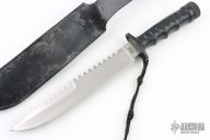 This survival knife by Parker-Imai features a satin finished blade with sawteeth on the spine, .179" blade stock and 1.386" blade depth, black coated aluminum hollow handle with a knurled black steel removable butt cap. Comes with a black leather sheath. Has some light scratches and some wear on the handle finish, has some staining on the sheath, otherwise good condition.
