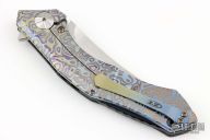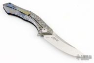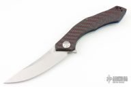 This 0462 Sinkevich Design flipper by Zero Tolerance features a satin finished upswept blade with flipper and swedge. The handle has a red/black carbon fiber, custom anodized titanium frame, black aluminum backspacer and a tip up reversible titanium clip. Nice detent, lockup and blade seating, rides on bearings. Has stainless steel lockface insert and overtravel stop, ceramic detent ball. S/N 7574. Comes with original box and papers. Excellent condition.