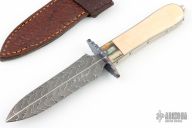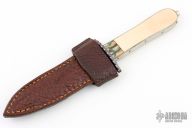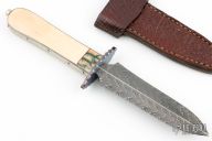 This Knife from Mr. Pease features a Damascus double edged blade with .162" blade stock and 1.255" blade depth, mortise/frame tang construction. The handle has a fileworked mokuti guard, mammoth ivory inlays framed with a fileworked nickel silver frame with an amythest stone set in the butt. Comes with a brown leather sheath. Excellent condition.