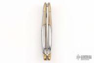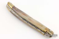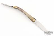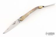 This knife by Laguiole features a mirror polished clip point blade with a nail nick.  The handle features brass bolsters/liners over a fileworked steel backspring and honey horn covers. Has a fork that extends from the butt of the handle. Excellent Condition.