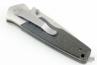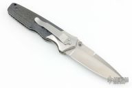 This Assisted Opening by Butch Vallotton features a hand rub satin finished spear point blade with swedge, notched thumbrest and dual thumb studs. The handle has stainless steel bolsters and carbon fiber scales over jeweled titanium liners and a black G10 backspacer. Stainless steel tip down clip. Has light scratches otherwise the knife is in Excellent Condition.