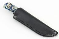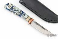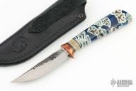 This Bird and Trout by James Behring features a satin finished and hammer marked blade with false top edge, .121" blade stock and .686" blade depth, hidden tang construction. The handle has a copper guard, black/copper/muskox/white spacers, and the grip is kudu teeth stabilized in resin. Comes with a black leather sheath. Excellent condition.