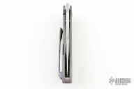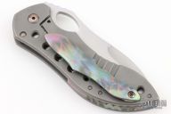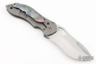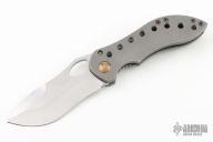 This Mini Skirmish by Neil Blackwood features a hand rub satin finished blade with notched thumbrest and thumbhole. The handle has a stonewash finished titanium frame, textured and anodized titanium backspacer and tip up clip. Nice detent, lockup and blade seating. Comes with a velcro case. Has a couple light scratches, otherwise excellent condition.