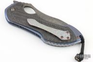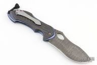 This full sized Skirmish by Neil Blackwood features a Damascus blade with thumbhole and notched thumbrest, false top edge. The handle has an anodized and stonewash finished titanium frame, carbon fiber overlays with mosaic pin inlays, textured and anodized tip up titanium clip and backspacer. Comes with a black leather belt sheath. Excellent condition.