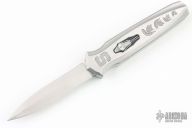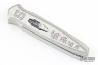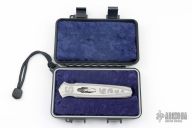 This Triton II OTF Auto by Jeffrey Harkins features a hand rub satin finished double edged blade. The handle has a two tone 416 stainless steel frame with bead blast finished bevels and millings, satin flats, milled stainless steel thumbslide with a 2mm opal inset. The handle is engraved with the Michigan State Trademark. Excellent work. Comes with hard-case and provenance papers dated September 21, 2016. Has a couple very light scratches, otherwise excellent condition.