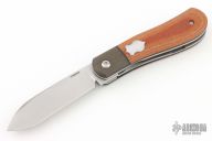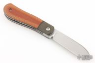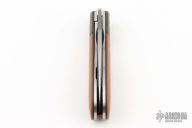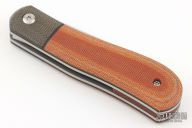 This Dogleg Front Flipper by Enrique Pena features a hand rub satin finished drop point blade with a notched thumbrest and front flipper. The handle has green canvas micarta bolsters, natural canvas micarta scales over black liners, titanium liners, brown canvas micarta backspacer.  Stainless steel shield. Includes padded zippered case. New from maker.