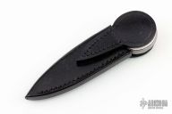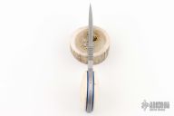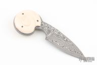 This Derringer Palm Push Dagger by Anders Hogstrom features a Gysinge Damasteel blade with false top edge and notched thumbrest, .218" blade stock and 1.092" blade depth, full tang construction. The handle has carved mammoth ivory scales with blue liners. Comes with a black leather sheath. Comes with nylon velcro case. Excellent condition.