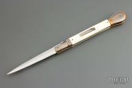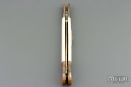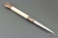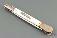 This Picklock from Lee C. Reynolds features a mirror polished blade with false top edge. The handle has super conductor bolsters, button and pommel with mammoth ivory scales over brass liners and stainless steel backspacer. Excellent condition.