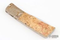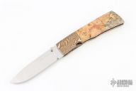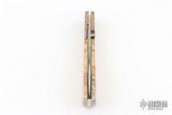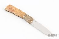 This linerlock by Steve Hostetler features a mirror polished blade with single thumbstud. The handle has Mokume dovetailed bolsters, stabilized California Buckeye Burl scales, anodized titanium liners with jeweled interiors, polished stainless steel backspacer. Nice lockup and blade seating. Comes with a nylon zippered case. Has some light scuffs and scratches, great condition otherwise.