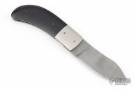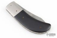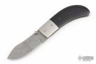This linerlock by Jay Harris features a raindrop Damascus blade with upswept blade and single thumbstud. The handle has satin finished titanium bolsters, African Blackwood scales, fileworked backspacer, and satin finished titanium liners. Blade play in the open and closed position. Has some light scuffs, otherwise excellent condition.