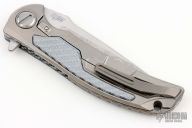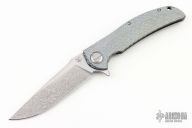 The robust and recognizable design of RJ Martin mixed with the sleek and functional Shirogorov style! The Alutex scale and inlay combined with the ZDI-1016 damascus are ice cold! For those that didnt know, Alutex is an aluminum and glass based mixture that is very similar to carbon fiber in both looks, weight, and durability.. The two materials are layered together and then adhesively bonded to one another. The end result is a super strong, super lightweight material that thanks to the aluminum can achieve a wide array of color options! The handle shape is pure RJ, with a curving profile and single finger groove design. The floating titanium backspacer has robust jimping for extra grip. The scales are cut away at the rear end for the lanyard hole. The titanium lockside has been extensively milled out and windowed for weight reduction. The blade features a long drop point profile with raised, jimped thumb ramp. The blade features a stunning two tone finish, with brushed sating flats and a damascus pattern on the bevels. The blade is tuned to deploy with a very solid press of the flipper tab, just like you would find on one of RJ's custom knives, and deploys lightning fast and smooth on roller bearings. Lots of small details are present as you would expect from Shirogorov. The custom titanium pivot hardware has a two tone tumbled finish. The frame, floating backspacer and machined pocket clip all have a matching matte tumbled finish that ads a subtle contrast. The titanium scale has been milled out under the pocket clip for easier clipping and unclipping from your pocket. The scales have subtle scalloping for extra grip at the spine. The backspacer has been precisely machined to allow the blade to close within its footprint, allowing for the renown Shirogorov ratio of maximum blade size to frame fit.