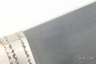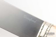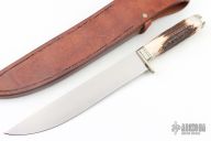 This Searles Bowie by Pat Crawford features a hand rub satin finished blade with .206" blade stock and 1.404" blade depth, hidden tang construction. The handle has a fileworked nickel silver guard and butt with a stag grip. Comes with a brown leather sheath, zippered case, comes with a Crawford Knives catalog from the 80s. Excellent condition.