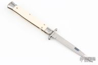 This 11" Swing Guard Auto by Frank Beltrame features a bayonet ground blade with false top edge. The handle has stainless steel bolsters, front and rear, imitation ivory scales, brass liners, stainless spring. Excellent condition.