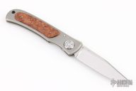 This linerlock folder by Howard Hitchmough features a mirror polished blade with notched thumbrest and single thumbstud. The handle has a bead blasted titanium frame, burl wood overlays with nickel silver pin accents, fileworked stainless steel backspacer. Smooth action. Nice detent and lockup. Comes with a zippered case. Has some light scuffs, otherwise excellent condition.