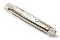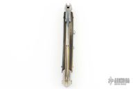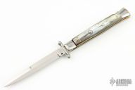 This 11" Swing Guard Auto by Frank Beltrame features a 4mm bayonet ground blade with false top edge. The handle has stainless steel bolsters, front and rear, Brazilian horn scales, brass liners, stainless spring. Excellent condition.