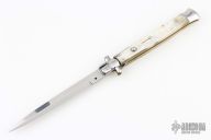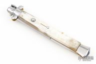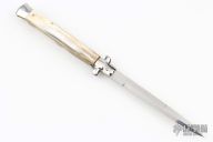 This 13" Swivel Bolster Auto by Frank Beltrame features a bayonet ground blade with false top edge. The handle has stainless steel bolsters, front and rear, Honey horn scales, brass liners, stainless spring. Excellent condition.