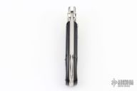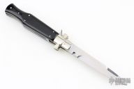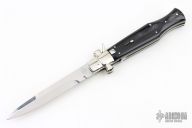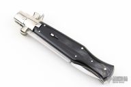 This Black Widow Auto by A.G.A. Campolin features a polished satin bayonet ground blade with false top edge. The handle has nickel silver bolsters, Dark horn scales, nickel silver liners, stainless spring. Comes with original box, COA, and leather slip. Fires hard, and uses the lever to release the blade; Very cool piece. Excellent condition.