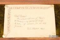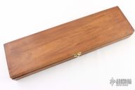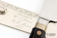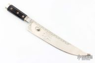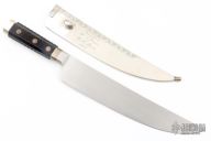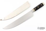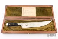This Rezin Bowie by Jimmy Lile features a hand rub satin finished blade with .202" blade stock and 1.826" blade depth, hidden tang construction. The handle a stainless steel and nickel silver bolsters, nickel silver butt with "RLM" engraved on the butt, hand checkered ebony grip. #3 of 6 on the bolsters. Comes with an engraved nickel silver scabbard and wooden presentation box. The sheath is engraved with "Presented to WS Peace by RL Moore 1977". Has some light scratches, otherwise excellent condition.
