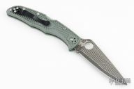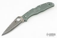 This Spyderco Endura knife has a foliage green handle and a full-flat ground zebra damascus blade with a plain cutting edge.