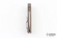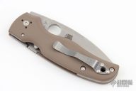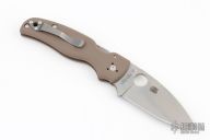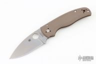 The new BladeOps Exclusive Spyderco Shaman features a brown G-10 handle, skeletonized stainless steel liners, a satin finshed leaf shaped CPM 15V blade, and Spyderco's trademark round hole opening feature.
