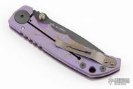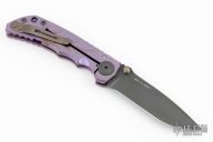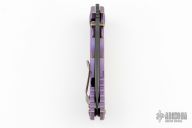 This Harsey framelock folder by Spartan Blades features a black drop point blade with dual thumbstuds and a notched thumbrest. The handle has a purple anodized titanium frame with a laser engraving a tip up titanium clip and filler tab. Has nice detent, lockup, and blade seating. Comes with original box. Excellent condition.