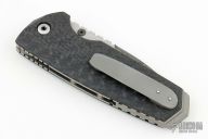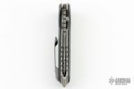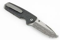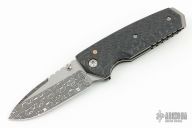 This linerlock folder by Allen Elishewitz features a two-tone damascus blade with notched thumbrest and single thumbstud. The handle has carbon fiber scales, tumbled titanium liners, bead blast stainless steel tip up clip. Smooth action. Nice detent, blade seating and lockup. Has a couple light scuffs, otherwise excellent condition. Comes with a zippered case.