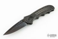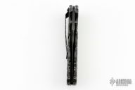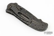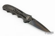 This Express from Crawford Knives features a black blade with jeweled flats, false top edge and dual thumbstuds. The handle has black DLC titanium scales with jeweled finish, DLC fileworked titanium liners with jeweled interiors, DLC stainless steel fileworked backspacer, tip down titanium clip that is DLC, jeweled and fileworked. Nice detent, lockup and blade seating. Comes with a zippered case. Excellent condition.