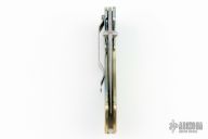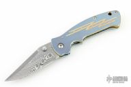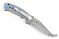 This Mini Kasper linerlock folder from Crawford features a Damascus blade with dual thumb studs and false top edge. The handle is anodized and machined titanium frame over a fileworked stainless steel backspacer. Fileworked stainless steel tip down clip. Includes padded and zippered case. Excellent condition.