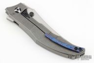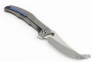 This Persian by Custom Knife Factory is a Peter Rassenti Design.  The knife has a two-tone finished blade with a notched thumbrest and flipper. The handle has a tumbled titanium frame with tip up zircuti clip, lanyard hole, stainless lock face insert with overtravel stop.  Zircuti pivot collars. Rides on bearings, nice detent, lockup and blade seating. #859 on flipper tab. Comes with nylon Velcro case and COA. Excellent condition.