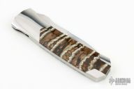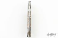 This Kingfisher interframe folder features Sawby's patented self-lock. It has a hand rub satin finished blade with nail nick and false top edge. The handle has a mirror polished stainless steel frame with mammoth tooth inlays. Nice lockup and blade seating.  Excellent coniditon.