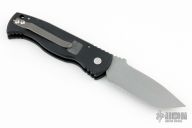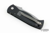 This CQB7 Auto by Rob Dalton features a bead blasted chisel ground tanto partially serrated blade with a notched thumbrest. The handle has a black aluminum frame with non-slip inlays, a tip up bead blasted titanium clip, lanyard hole at the butt. Has a few scuffs, otherwise excellent condition.