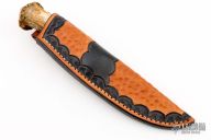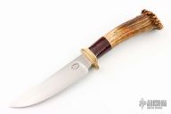 This Hunter by Mike Sanders has a hand rub satin finished blade with hidden tang, .147" blade stock and 1.101" blade depth, hidden tang construction. The handle has a fluted brass guard and a crown stag grip with maroon paper micarta spacers. Comes with a hand tooled leather sheath with belt loop. Excellent condition.