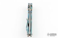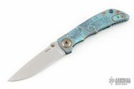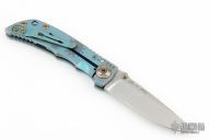This Harsey framelock folder by Spartan Blades features a stonewashed drop point S45VN blade with dual thumbstuds and a notched thumbrest. The handle has an anodized titanium frame with a laser engraving a tip up titanium clip and filler tab. Has nice detent, lockup, and blade seating. Comes with original box. Has a couple light scuffs, has been resharpened, otherwise excellent condition.