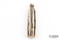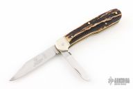 This knife by Hubertus is unique, it features two satin finished blades. The larger blade is an auto and is fired by pressing down on the back of the small blade. The handle has nickel silver bolsters, stag scales, brass liners and steel springs. Has some light scuffs and scratches, good condition otherwise.