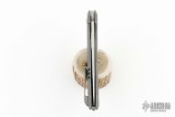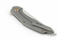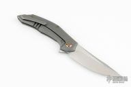 This Flipper by WE Knives features a satin finished upswept blade with a notched flipper tab.  The handle has a titanium frame, backspacer, and a matching tip up clip, stainless lockbar insert. Nice detent, lockup and blade seating. Has ceramic ball bearings. Comes with original zippered case and COA. #022/210.  Excellent condition.