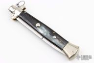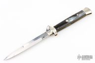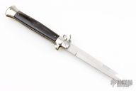 This is Ring Pull Auto by AGA Campolin with a mirror polished spear point blade with false top edge. Nickel silver bolsters and butt with Brazilian Horn scales, brass liners, stainless steel backspacer. Nice action. Has a few light scratches, otherwise excellent condition.