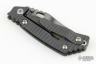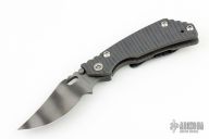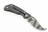 This PT Persian by Mick Strider features a tiger striped blade with notched thumbrest and thumbhole. The handle has a flame finished titanium frame with matching tip up clip. Excellent condition.