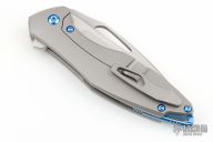 This Mini Arius by Koenig knives features a Purnished w/ PF finished blade with thumbhole and flipper. The handle has a bead blasted titanium frame with a titanium tip up clip, anodized titanium backspacer. Has ceramic bearings and a ceramic detent ball. Nice detent, lockup and blade seating. Comes with original box and COA August 17, 2023. Excellent condition.