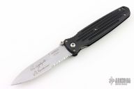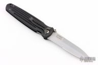 This Applegate Fairbairn Combat Folder by Gerber has a bead blasted stainless steel partially serrated spear point blade with dual thumb studs and false top edge. Handle is black contoured polymer with single stainless steel liner and lanyard hole. Excellent condition. Comes with original box and sheath.