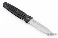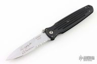 This Applegate Fairbairn Combat Folder by Gerber has a bead blasted stainless steel partially serrated spear point blade with dual thumb studs and false top edge. Handle is black contoured polymer with single stainless steel liner and lanyard hole. Excellent condition. Comes with original box and sheath.