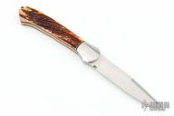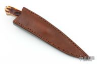 This knife by Jeff Cover features a hand rub satin finished blade with false top edge, .151" blade stock and .722" blade depth, full tang construction. The handle has dovetailed stainless steel bolsters, worm groove jigged bone scales with black liners. Comes with a brown leather sheath. The makers mark has been stamped upside down and backwards, i assume this was an accident. Has some light scratches, otherwise excellent condition.