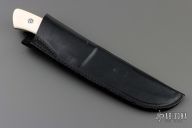 This Hunter by Tommy Lee features a mirror polished blade with .215" blade stock and .993" blade depth, full tapered tang construction. The handle has engraved nickel silver guard, mammoth ivory scales with black liners and engraved nickel silver pins. Comes with a black leather sheath. Has a couple cracks in the scales, otherwise good condition.