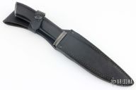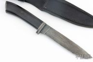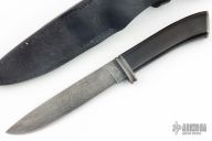 This Hunter by Master Smith Steve Schwarzer features a Damascus blade with .175" blade stock and 1.039" blade depth, hidden tang construction. The handle has a fluted Damascus guard, ebony wood scales with a Damascus butt. Comes with a black leather sheath. Excellent condition.